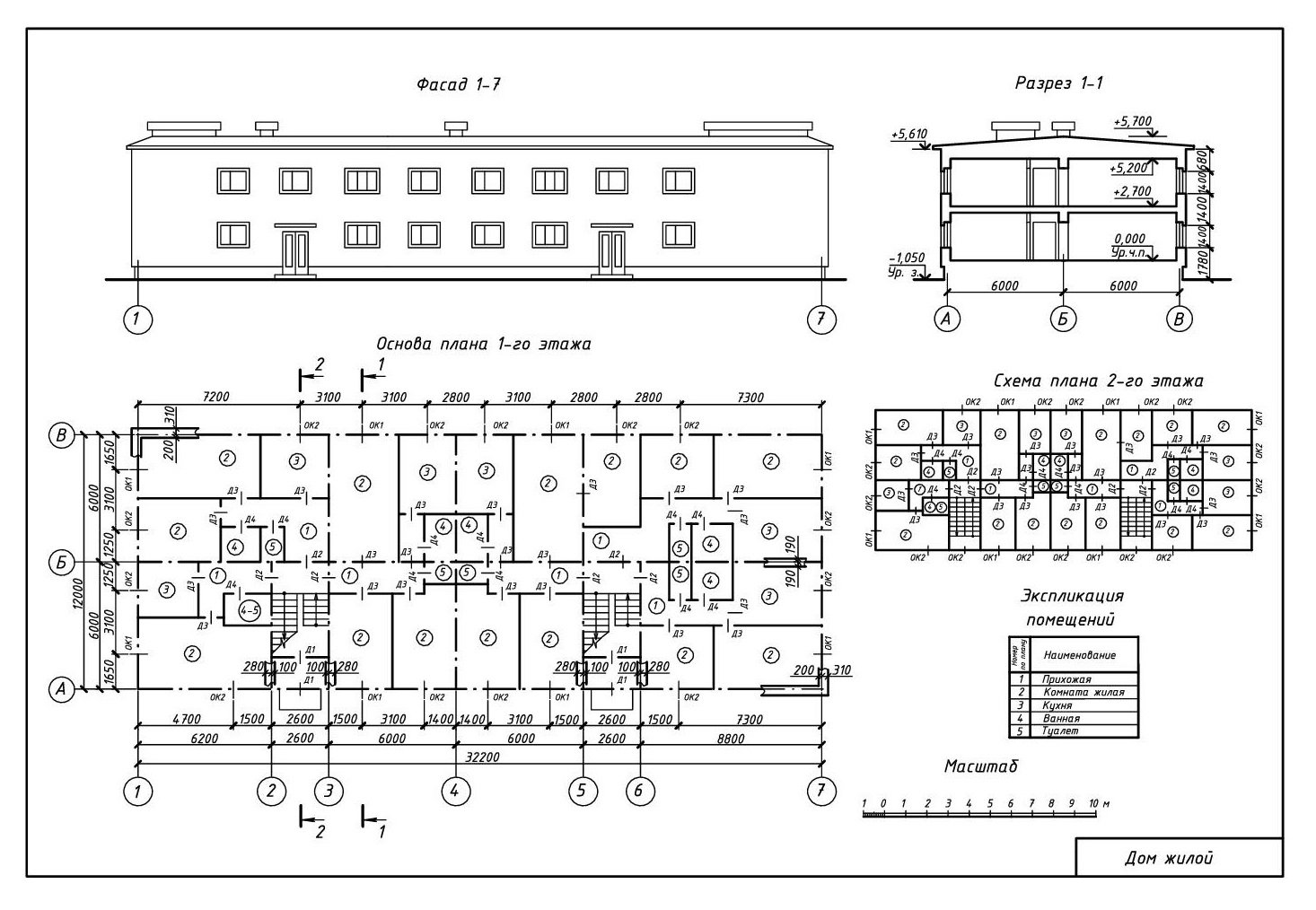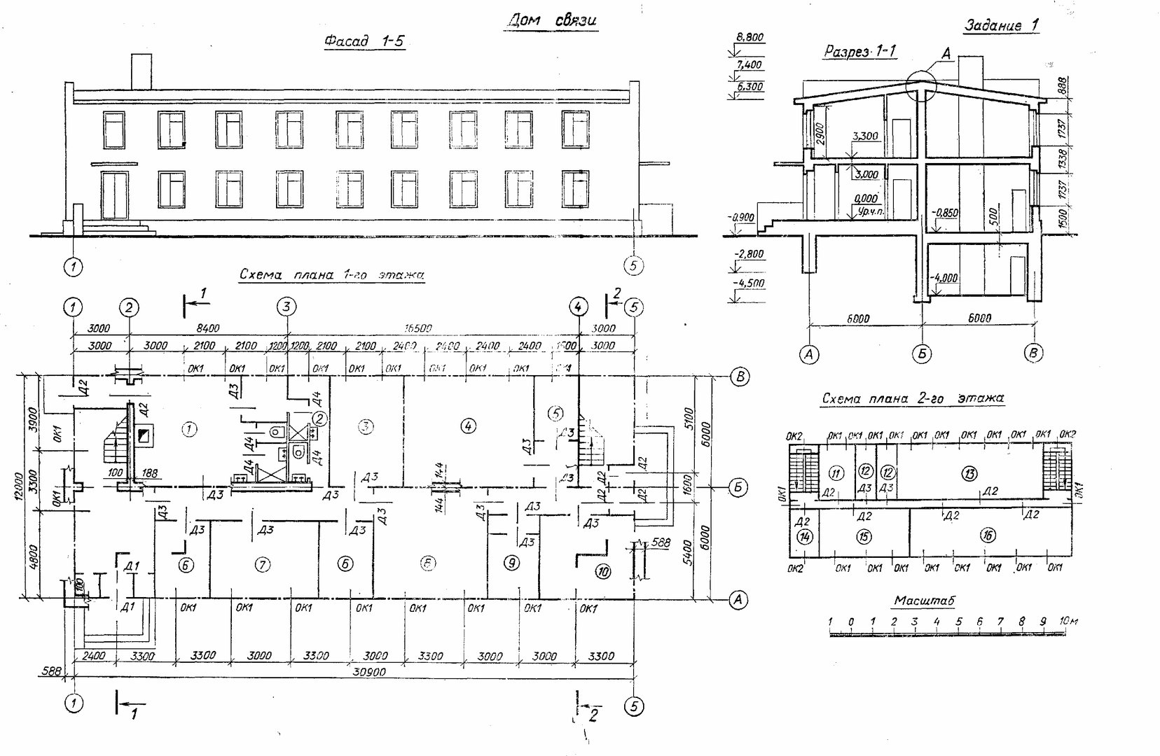 Чертеж двухэтажного здания план фасад разрез